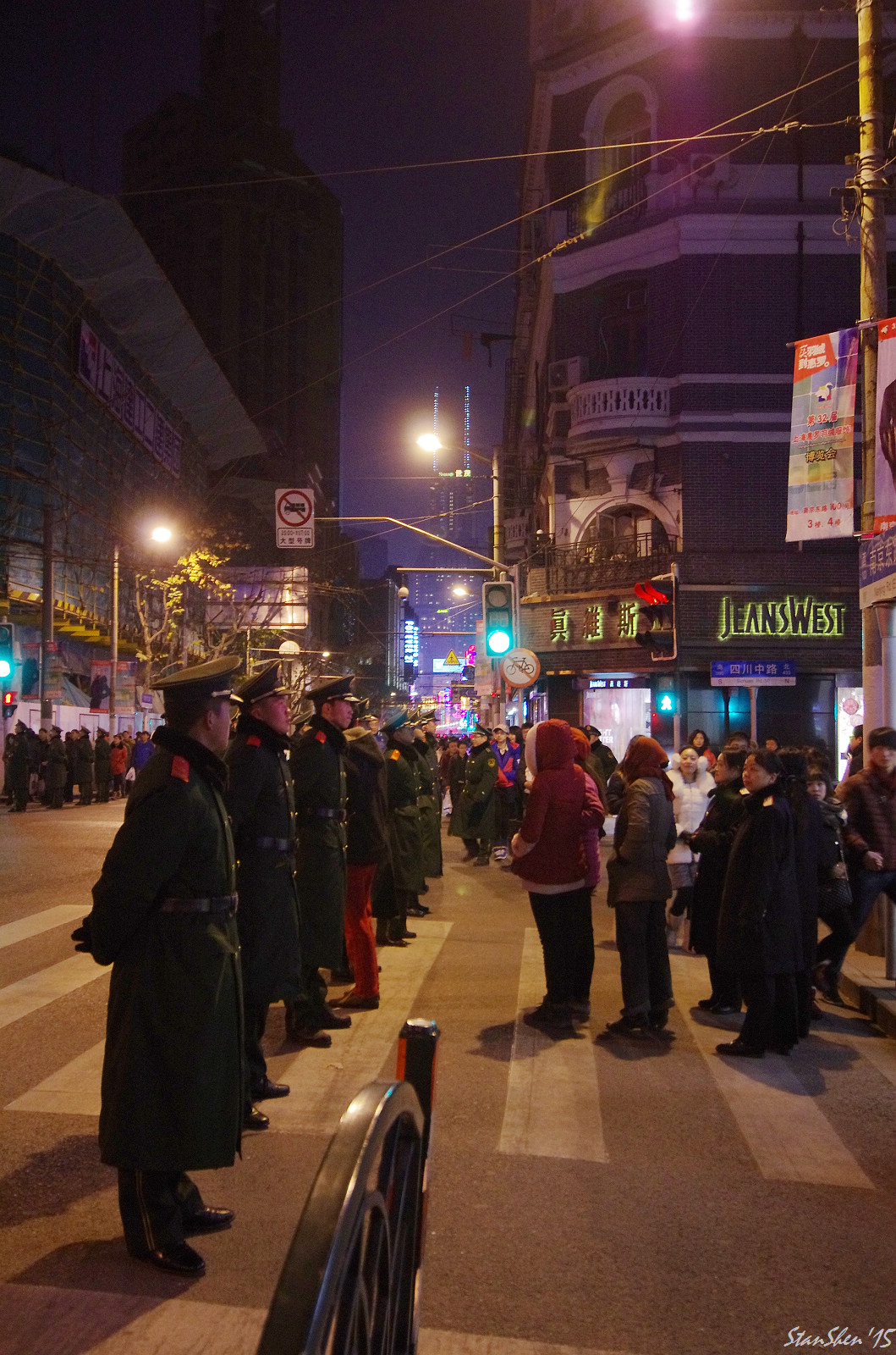 往外灘的路上,每個十字路口都站了整排的武警,以身擋車,協助人民安全的穿越馬路,這種景象令人印象深刻.